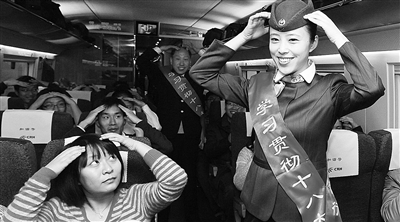 11月16日,列车乘务员在带领旅客体验自创的保健操缓解疲劳。