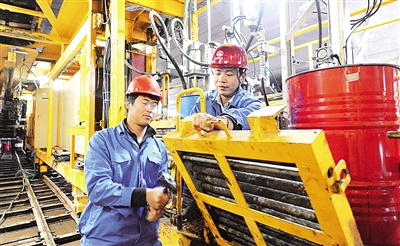 11月17日,北京地铁6号线二期工程玉带河大街站工区,中铁六局工作人员正在对盾构机进行保养操作。当天,北京地铁6号线二期工程举行首台盾构机始发仪式。据介绍,北京地铁6号线二期线路长约12.47公里,设车站7座,计划于2014年底通车。 本报记者