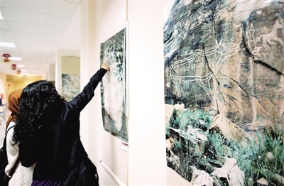 11月19日,在土耳其伊斯坦布尔,观众参观宁夏岩画艺术展。当日,作为土耳其“中国文化年”系列活动之一,“久远的记忆——宁夏岩画艺术特展”在土耳其伊斯坦布尔的孔子学院举行。展览展出了宁夏最具代表性的人面像岩画、狩猎岩画、动物岩画和岩画拓片等50余幅作品,展览将持续到11月25日。 新华社发