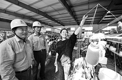 浙江省绍兴市丰惠镇是全国知名的劳保手套、袜业出口基地之一,当地供电部门大力实施新农村电气化建设和新一轮农网升级改造,为产业发展提供电力保障。图为绍兴上虞供电局工作人员到当地一家企业开展上门服务,指导企业用户安全用电。