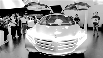 上图 本届展会上,首次亮相的一款梅赛德斯-奔驰零排放概念车吸引了很多观众的关注。 杨忠阳摄