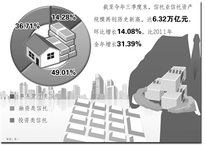 数据显示,截至2012年三季度末,体现信托服务功能的事务管理类信托仍然仅占全行业信托资产规模的14.28%,体现信托理财功能的融资类信托和投资类信托则占到全行业信托资产规模的85.72%。