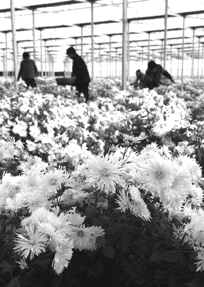 11月23日,在河北省永清县胜利新村温室大棚里,农民在采摘菊花。近日,当地种植的温室河北香菊进入收获期,香菊种植已经成为农民增收致富的新途径。