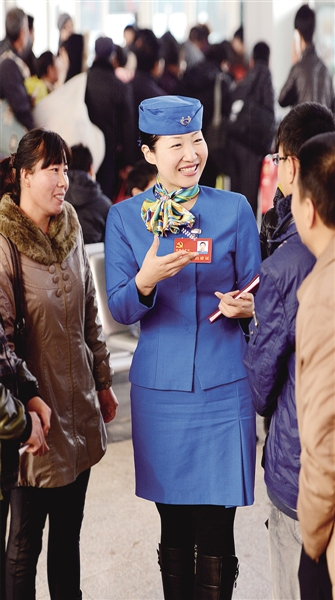 党的十八大代表、河北保运集团保定汽车总站郭娜陆地航空班班长郭娜(中)正在给候车的旅客宣讲党的十八大报告,通俗易懂的讲解深受欢迎。