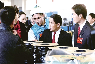 党的十八大代表杜钧、刘田家、斯日古楞(从右至左)在天津一家生产农业灌溉节水设备的企业,就加快新技术新产品新工艺研发应用、加强技术集成和商业模式创新进行调研。