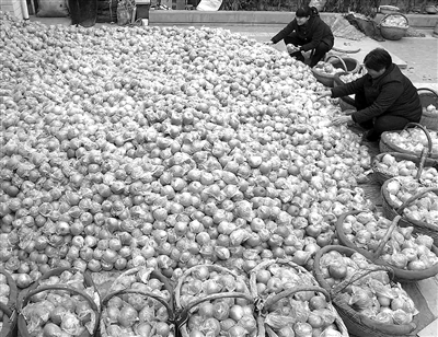 左图 2012年11月24日,运城市万荣县南张乡百帝村果农在自家院子分拣苹果准备储存,当日优质苹果的收购价为每公斤2.6元。