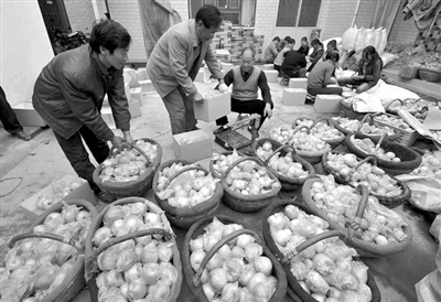 下图 2011年11月6日,运城市万荣县南张乡百帝村果农将苹果分类装箱,以每公斤高于5元的价格出售。