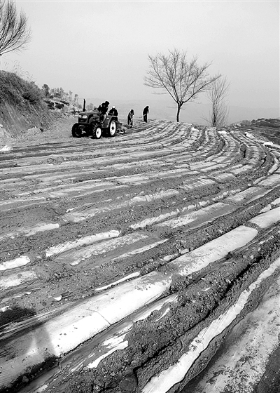 ① 11月21日,甘肃省临夏回族自治州永靖县川城镇农民在田间覆膜保墒。 史有东摄(新华社发)
