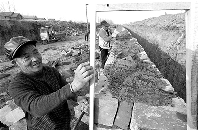 ③ 11月24日,在小农水重点改造项目——山东省临沂市莒南县徒山灌区主干渠工地上,工人在加紧施工。