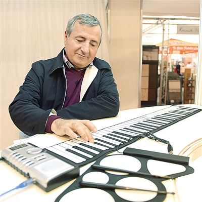 11月26日,在阿尔巴尼亚首都地拉那举行的阿尔巴尼亚国际贸易展上,一名阿尔巴尼亚商人在中国企业展位上试弹“折叠钢琴”。当日,第19届阿尔巴尼亚国际贸易展览会在地拉那开幕。展会为期5天,来自意大利、希腊、马其顿、德国、中国等20余国的近300家厂商参展。 新华社发