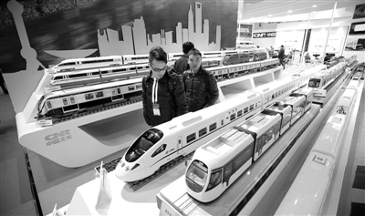 11月27日,第十一届中国国际现代化铁路技术装备展览会上,参观者在中国北车集团展区参观列车模型。中国铁路制造业巨头中国南车和中国北车展出了它们在铁路机车车辆领域的新产品及新技术。