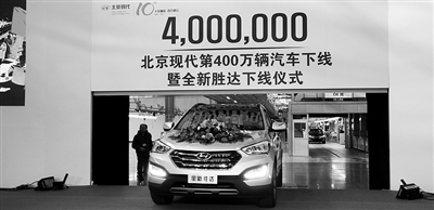 11月26日,北京现代第400万辆汽车下线暨全新胜达下线仪式在北京现代第三工厂举行。截至目前,北京现代累计实现销售额3930亿元,利润487亿元。