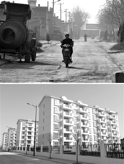 上图:村民骑行在胜溪新村的旧街道上;下图:胜溪新村新建的村民安置房干净整洁,道路平整。