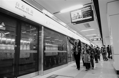11月29日,在即将开通的北京地铁9号线北段白石桥南站,老师带领孩子们参观站台。当天,北京轨道交通部门邀请部分学生参观即将开通的地铁新线路,体验无障碍设施,感受轨道交通为人们带来的出行便利。