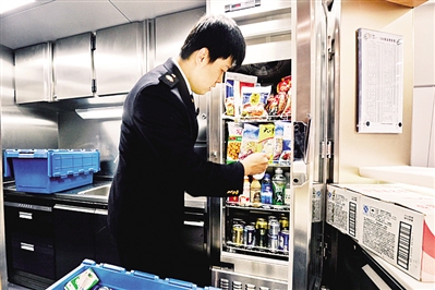 11月30日,乘务人员将食品摆放在餐车内的储物柜中。以上图片均由新华社记者 王 松摄