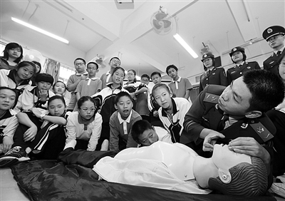 11月20日,4名即将退伍的广东边防总队深圳特检站卫生队老兵来到罗湖区外国语实验中学,向学生教授急救知识,受到了学生们的欢迎。