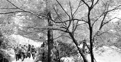 右图 11月28日,在西湖花港观鱼景区,游客们穿过一片枫树林。入冬以来,全国大部分景区进入了淡季。相比之下,杭州西湖景区却呈现出游客不减、淡季不淡的良好势头。