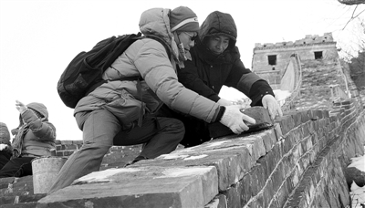 11月23日至28日,海峡两岸旅游交流协会邀请台湾14所高校165名旅游专业师生赴北京,开展以“华夏文明·薪火相传”为主题的修学旅游活动。图为台湾师生参加修复残长城活动。 徐万佳摄