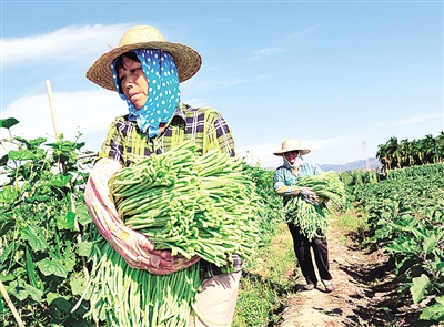 12月2日,三亚市崖城镇菜农将刚刚采摘的瓜菜运出菜地。据了解,三亚市目前每天装车出岛的瓜菜在50万公斤以上,主要运往广州、深圳、长沙、上海、武汉等瓜菜中转地。 新华社记者 侯建森摄