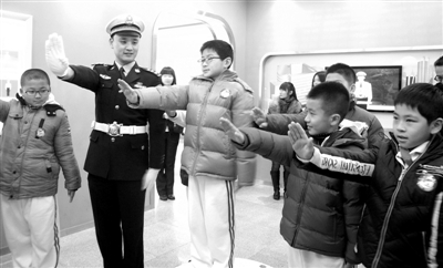 12月2日,北京市西城区交警孟昆玉在北京市交通安全宣传教育基地为小朋友们演示交通手势。