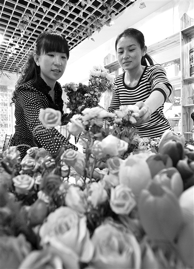 日前,在宁夏盐池县青年创业园内,顾客在大学毕业生王惠惠的店铺内选购室内装饰用花。2012年,宁夏回族自治区盐池县建成青年创业园,吸引大学生创业就业。目前,已吸引近30位大学毕业生前来投资创业。 新华社记者 彭昭之摄