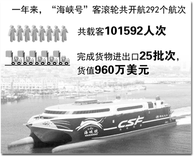 平潭是大陆离台湾最近的地方,平潭综合实验区,因台而设、因台而兴。实验区成立以来,构建两岸海上直航主通道成了两岸民众最期盼的事情,实验区更是以9个多月时间的“平潭速度”建起澳前客滚码头。2011年,“海峡号”从平潭出发直达台中港,标志着两岸海上直航主通道正式建立。一年来,“海峡号”共开航292个航次,共载客101592人次,其中大陆旅客76724人次,台湾旅客24345人次,港澳旅客74人次,外籍旅客449人次,落地签3500人次。在货物通关方面,完成货物进出口25批次,货值960万美元。