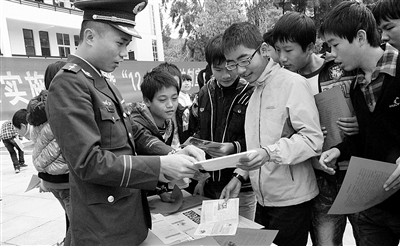 12月4日,福建公安边防总队莆田支队、莆田边检站官兵深入农村、农民工聚集地、社区、学校,提供法律咨询援助等法治实践活动。图为边防官兵为学生们揭穿各种诈骗手段。 吴 志 林智军摄