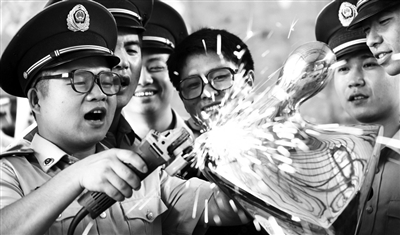 为帮助退役士兵就业、创业,武警广东边防七支队与驻地企业联合举办了汽修、通讯、安保等培训班,免费培训退伍兵。图为退伍兵在深圳市天之嘉艺术公司学习金属雕塑技术。据了解,该公司100多名员工中,有40多名是边防七支队的退伍兵。 廖 键 谭春亮摄