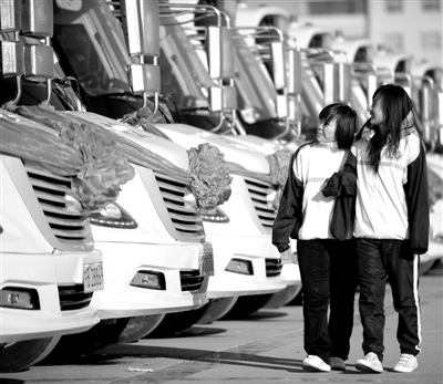 12月8日,两名学生在宁夏平罗县校车运营启动仪式上参观校车。