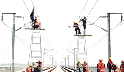 图⑤:哈尔滨供电段职工在哈大高铁线路上进行检修作业。
