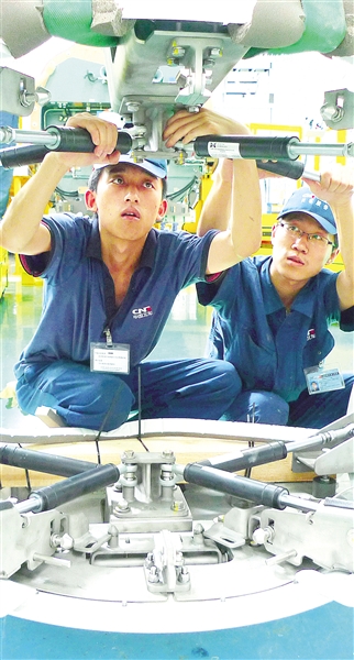 图⑥:北车高速列车装配调试现场。工人精益求精,确保质量。