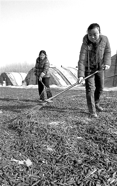 12月9日,河北省临西县后镇村辣椒种植专业合作社的社员在晾晒辣椒。