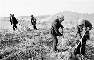 王水花与同村的几名妇女正在一块沙丘上打草方格压沙,头巾把自己包得严严实实,跟记者说了好一会儿话,记者也没看清她们的“真面目”。她说,她们一般早上6点多就开始赶往压沙点,一直要干到下午的5点多才回家,她们的午饭是就着凉水啃点干馍。“我这几十年来一直在压沙,从我家后墙外一直压到这里,现在这个地方离村子已经有七八公里远了,除了大风天气,平时我们的院子里外基本上没有沙子了。”
