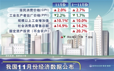 本报北京12月9日讯 记者顾阳从国家统计局获悉:11月份,CPI同比上涨2.0%,环比上涨0.1%,时隔两月后再次回到“2”时代;PPI同比降2.2%,同比增速连续两月出现回升;规模以上工业增加值同比实际增长10.1%,比上月加快0.5个百分点。