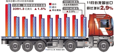 本报北京12月10日讯 记者顾阳从海关总署获悉:11月份,我国外贸进出口总值为3391.3亿美元,比去年同期增长1.5%。