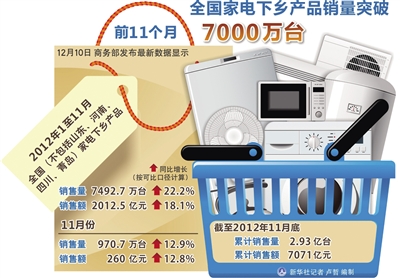 本报北京12月10日讯 记者亢舒从商务部获悉:今年1至11月,全国(不包括山东、河南、四川、青岛)家电下乡产品销售7492.7万台,实现销售额2012.5亿元,按可比口径计算,同比分别增长22.2%和18.1%。