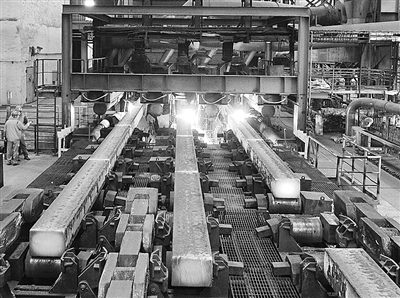 上图 东北特钢集团大连基地大型材生产线生产的连铸大方坯连续下线(2012年12月6日摄)。