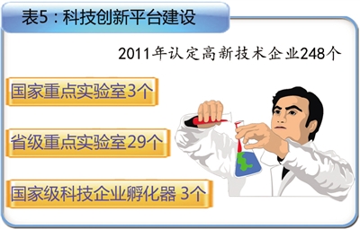 2011年,山西科技创新平台建设取得新进展,共建有国家重点实验室3个、省级重点实验室29个、国家级科技企业孵化器3个,并在煤化工、高端装备制造、新材料等领域培育了一批在全国具有重要影响的高新技术企业,全年共认定高新技术企业248个。(表5)