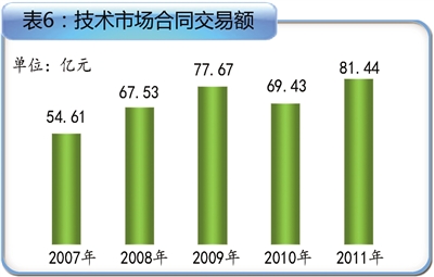 2011年,山西省技术市场各类技术合同成交总数达3423项,各类技术合同成交额达81.44亿元,比上年增加17.3%。(表6)