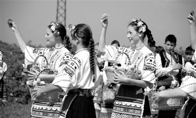 保加利亚姑娘向前来观摩玫瑰节盛典的外国游客抛撒玫瑰花瓣。 本报驻索菲亚记者 张春荣摄