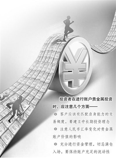 张磊认为,投资者在进行账户贵金属投资时,应注意以下几个方面。首先,客户应该有匹配自身能力的交易频度,过高频度交易很容易导致亏损产生,要建立中长期投资理念。其次,注意人民币汇率变化对贵金属账户价值的影响。第三,充分进行资金管理,切忌满仓入场,要保持账户充足的流动性,同时,宜顺应市场走势操作。
