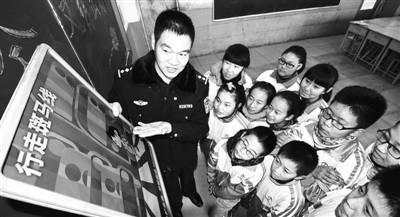 12月16日,河北邢台交警四大队的民警在为邢台七中的学生讲解交通安全知识。