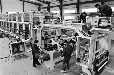 图①:作为山西省经济转型综改试验区试点,运城市盐湖区政府重点扶持一批中小微企业转型项目。图为运城市的制造业员工在生产印刷机。 (新华社发)