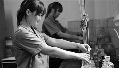 图②:曾因污染而环境恶化的陕西省府谷县狠抓污染治理,以科学发展理念走上了绿色发展之路。图为恒源煤焦电化公司员工进行水质化验。(新华社发)
