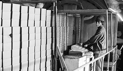 图③:太原钢铁集团大力发展循环经济,已能生产出以工业废料为主要原料的砖块,能有效减少环境污染。图为该集团工人在制砖。 (新华社发)