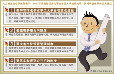 据新华社北京12月18日电 (记者赵超 徐博) 人力资源社会保障部部长尹蔚民18日在全国人力资源社会保障工作会议上表示,明年我国继续深化事业单位人事制度改革,同时明确了改革的四大重点。