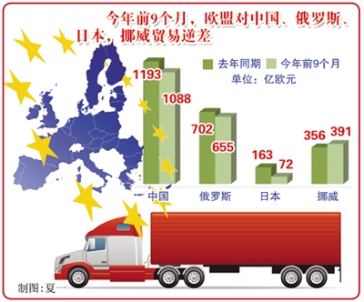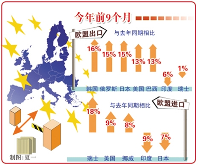 统计数据显示,今年前9个月,欧盟外贸顺差最大的成员国是德国,为1421亿欧元;其次是荷兰和爱尔兰,分别为362亿欧元和324亿欧元;欧盟外贸逆差最大的成员国是英国,为1219亿欧元;其次是法国和西班牙,分别为625亿欧元和273亿欧元。