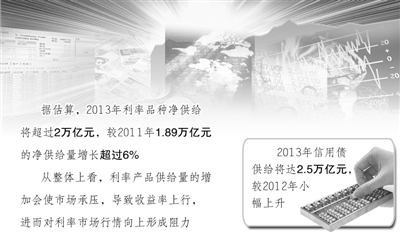 从利率产品供给角度来看,据业内人士估算,2013年利率品种净供给将超过2万亿元,较2011年1.89万亿元的净供给量增长超过6%。李一鸣认为,2013年金融债供给量将与今年持平,国债供给则有所上升。在近期中央减税、城镇化等政策的影响下,预计明年政府赤字将有所增加,国债的供应量也将随之上升。从整体上看,利率产品供给量的增加会使市场承压,导致收益率上行,进而对利率市场行情向上形成阻力。