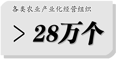 农业部最新数据显示,目前全国各类农业产业化经营组织超过28万个,辐射带动全国40%的农户从事农业生产经营,龙头企业11万多家,销售收入突破6万亿元,所提供的农产品及加工制品占农产品市场供应量的三分之一,占主要城市“菜篮子”产品供给的三分之二以上。