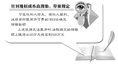针对目前实践中权利人维权成本高、往往得不偿失的现象,草案引入了惩罚性赔偿制度,规定对恶意侵犯商标专用权、情节严重的,可以在权利人因侵权受到的损失、侵权人因侵权获得的利益或者注册商标使用许可费的1到3倍的范围内确定赔偿数额。同时,草案还将在上述3种依据都无法查清的情况下法院可以酌情决定的法定赔偿额上限从50万元提高到100万元。